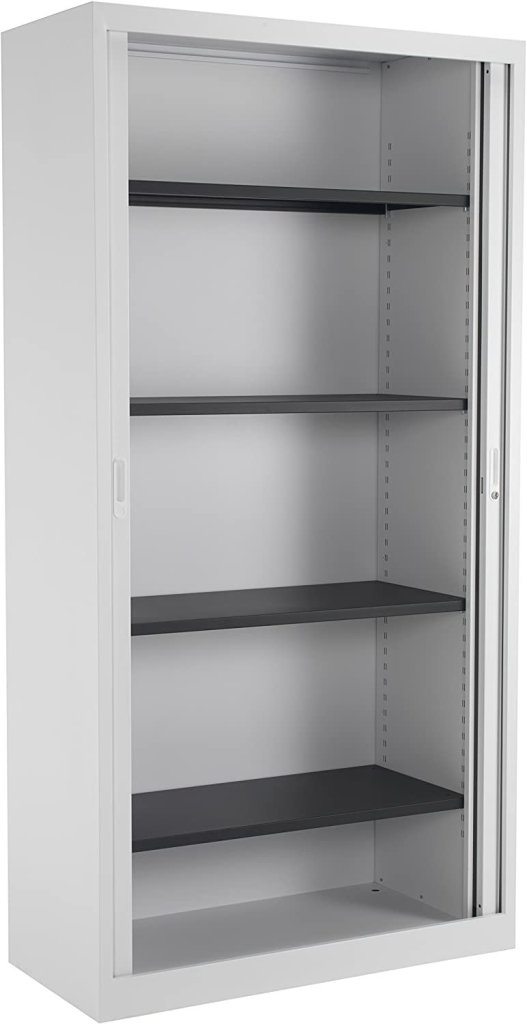 Kovová skříň s horizontální roletou se 4 policemi. Nosnost police 40 kg. Různé barvy na výběr. Výška 1990 x šířka 1000 x hloubka 435 mm.