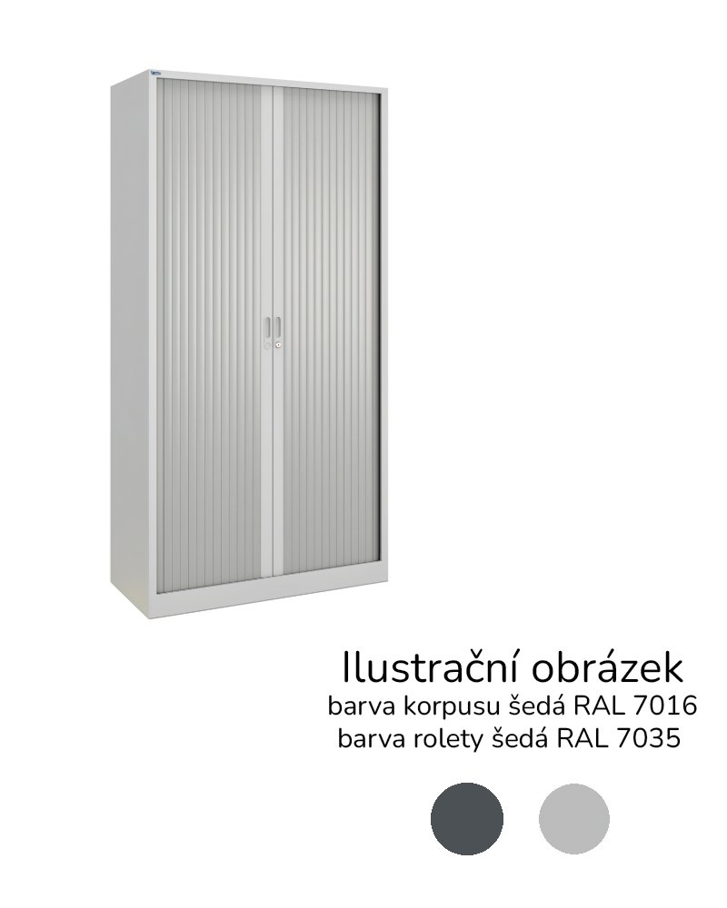 Kovová skříň s horizontální roletou se 4 policemi. Nosnost police 50 kg. Barva korpusu antracit RAL 7016 a rolety šedá RAL 7035. celý popis a parametry