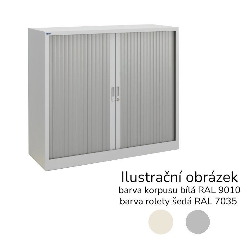 Kovová skříň s horizontální roletou se 2 policemi. Nosnost police 50 kg. Barva korpusu bílá RAL 9010 a rolety šedá RAL 7035. Výška 1050 x šířka 1000 x hloubka 450 mm.