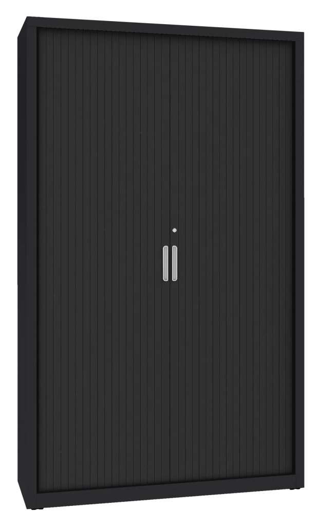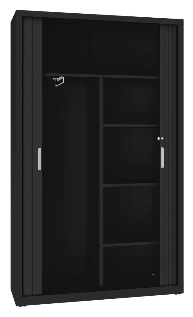 Kovová skříň s horizontální roletou se 4 policemi (3x krátká vpravo, 1x dlouhá nahoře). Nosnost police 40 kg. Vlevo prostor na kabáty. Různé barvy na výběr. Výška 1990 x šířka 1200 x hloubka 435 mm.