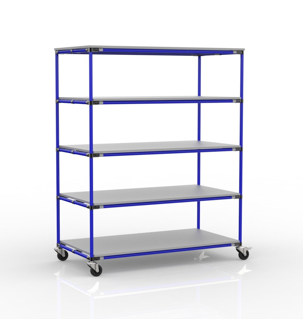Policový regál s pěti rovnými policemi je praktickým pomocníkem pro manipulaci ve výrobních firmách a logistických centrech, zejména v oblasti e-commerce. Součástí vozíku jsou čtyři otočná kolečka o průměru 100 mm. Předností těchto koleček je nízký valivý odpor a díku tomu komfortní manipulace. Konfiguraci koleček je možné změnit dle požadavků zákazníka. Celková nosnost 300 kg, nosnost na polici 75 kg. Rozměry 1900 x 1505 x 755 mm.