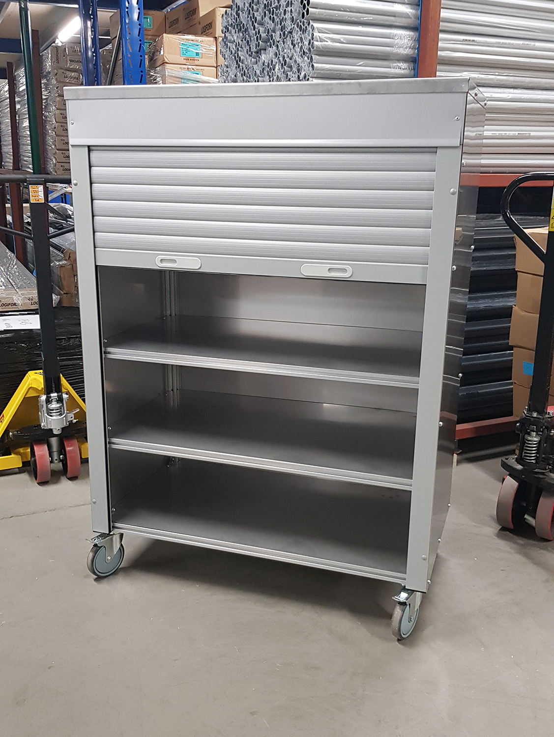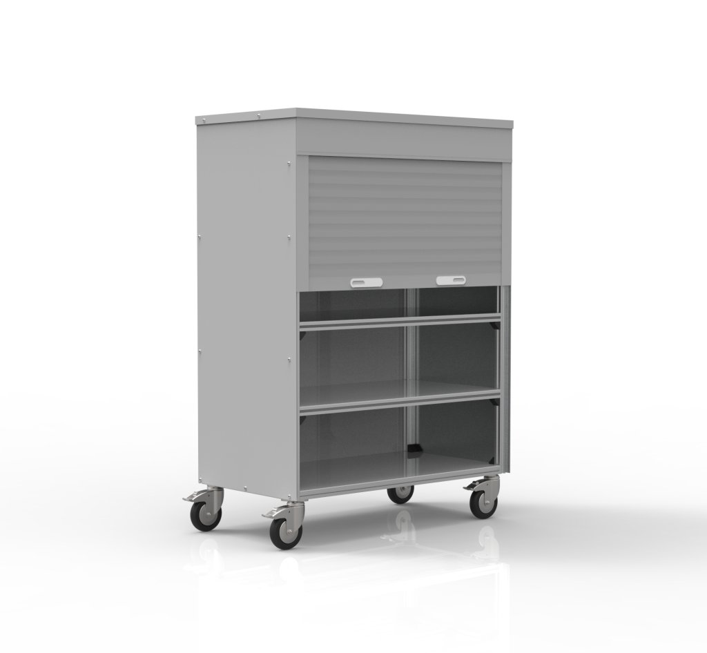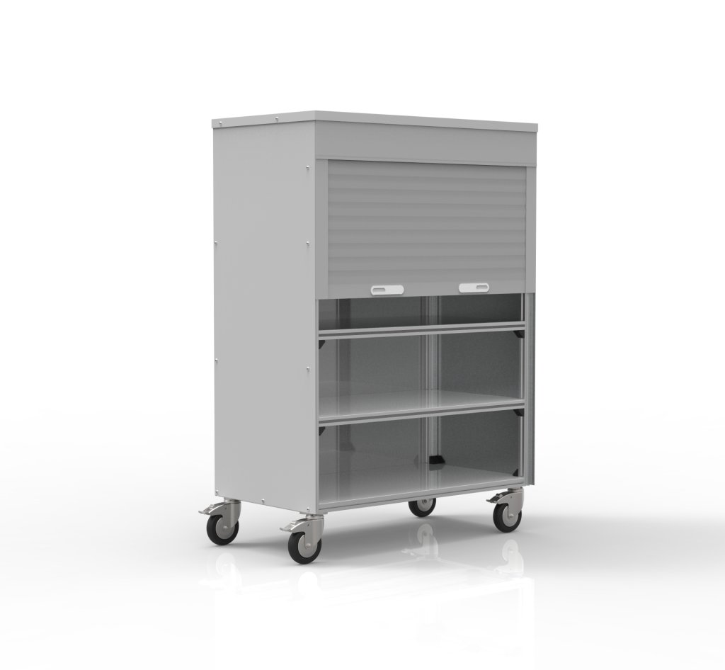 Policový vozík s roletou je vyroben z hliníkových profilů, což zaručuje nejen pevnost, ale také odolnost celé konstrukce. Součástí vozíku je roleta, tři police s lamino deskou tloušťky 18 mm, plastová madla pro snadnou manipulaci, boční a zadní strany jsou pokryty PET-G průhlednými deskami a čtyři otočná kolečka s brzdou o půrměru 100 mm. Nosnost vozíku 150 kg, nosnost patra 50 kg. Rozměry 1500 x 1250 x 640 mm.