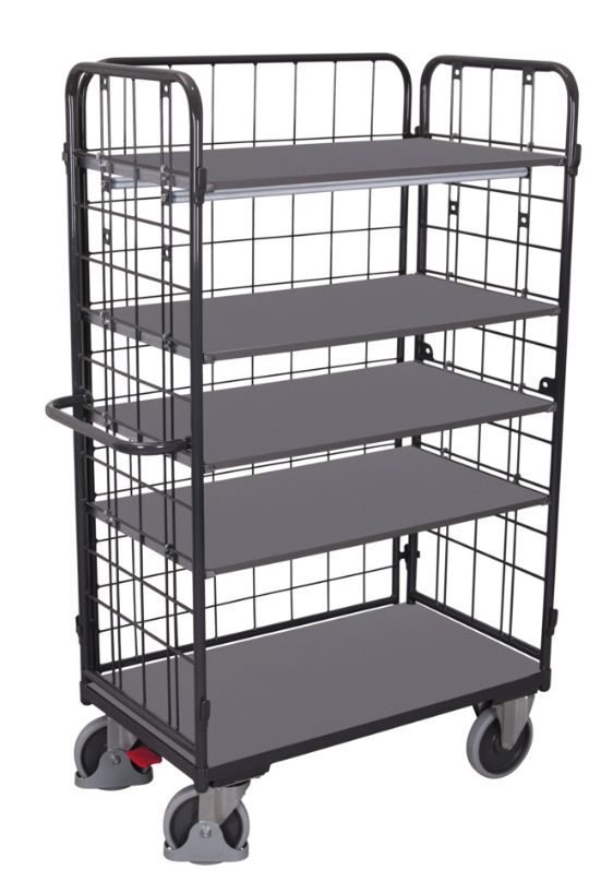 Kovová konstrukce, dřevěná ložná plocha - buk. Povrchová úprava práškovým lakem RAL 7016 antracit, odolná vůči nárazům a poškrábání. Vysoce odolná termoplastická kolečka s kuličkovým ložiskem, 2 otočná s centrální brzdou Easy Stop, 2 pevná. Rozměr výška 1820 x šířka 1390 x hloubka 825 mm. Velikost drátěných ok 120 x 120 mm. Police přestavitelné po 120 mm.