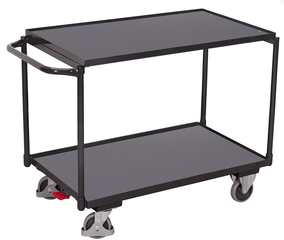 Ocelová konstrukce, dřevěná ložná plocha - tmavě šedá. Povrchová úprava práškovým lakem RAL 7016 antracit, odolná vůči nárazům a poškrábání. Vysoce odolná termoplastická kolečka s kuličkovým ložiskem, 2 otočná s centrální brzdou Easy Stop, 2 pevná. Rozměr výška 850 x šířka 1175 x hloubka 625 mm. Výška okraje 12 mm. 2 police. Nosnost 250 kg.