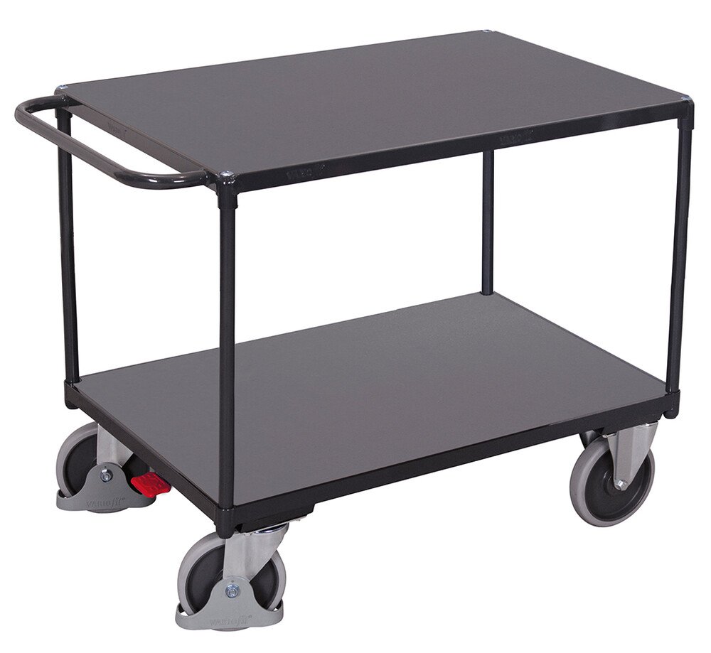 Dílenský pracovní vozík německé výroby, ocelová konstrukce, pracovní plocha je z překližky o síle 19 mm se zábranou z ocelového plechu o výšce 80 mm. Celý vozík je uzamykatelný. Skříňka obsahuje 2 odstranitelné police. Nosnost police 80 kg. 4 speciální pneumatická kolečka Fetra TPE, z toho 2 otočná s brzdou, 2 pevná.