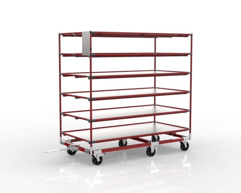 Policový vozík z jeklového podvozku s nástavbou z trubkového systému. Možnost zapojení více vozíků do vláčku. Vhodný pro přepravu materiálu a produktů.