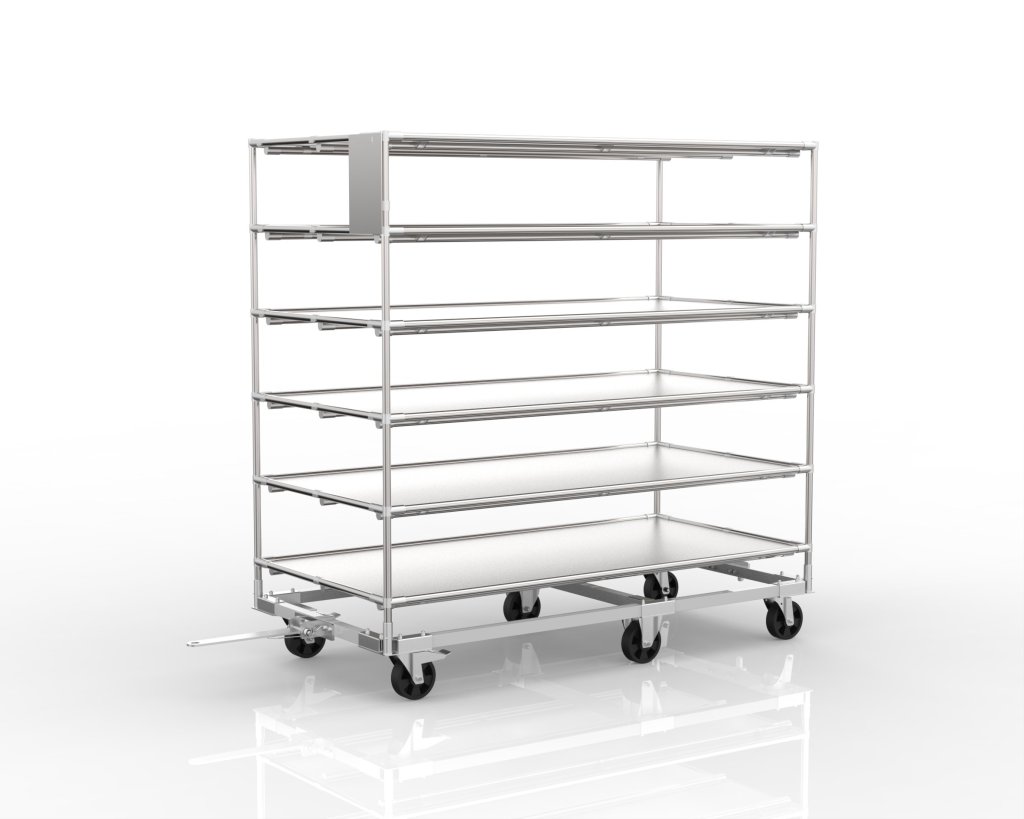 Policový vozík z jeklového podvozku s nástavbou z trubkového systému. Možnost zapojení více vozíků do vláčku. Vhodný pro přepravu materiálu a produktů.