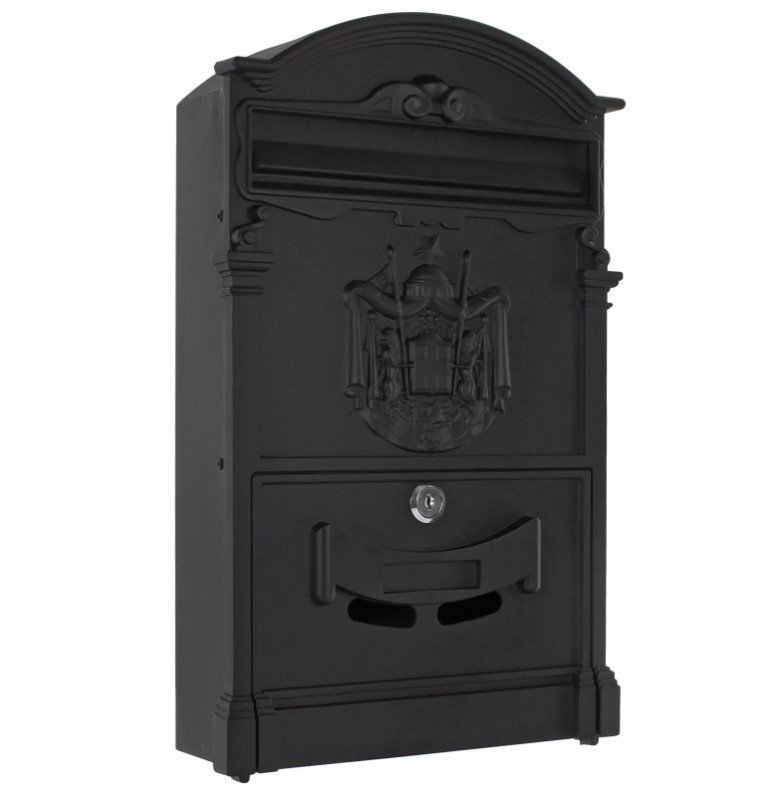 Kovová poštovní schránka s historickým motivem, pro vnitřní i venkovní použití, přední vhoz. Výška 410 x šířka 260 x hloubka 90 mm. Barva antracit nebo červená.
