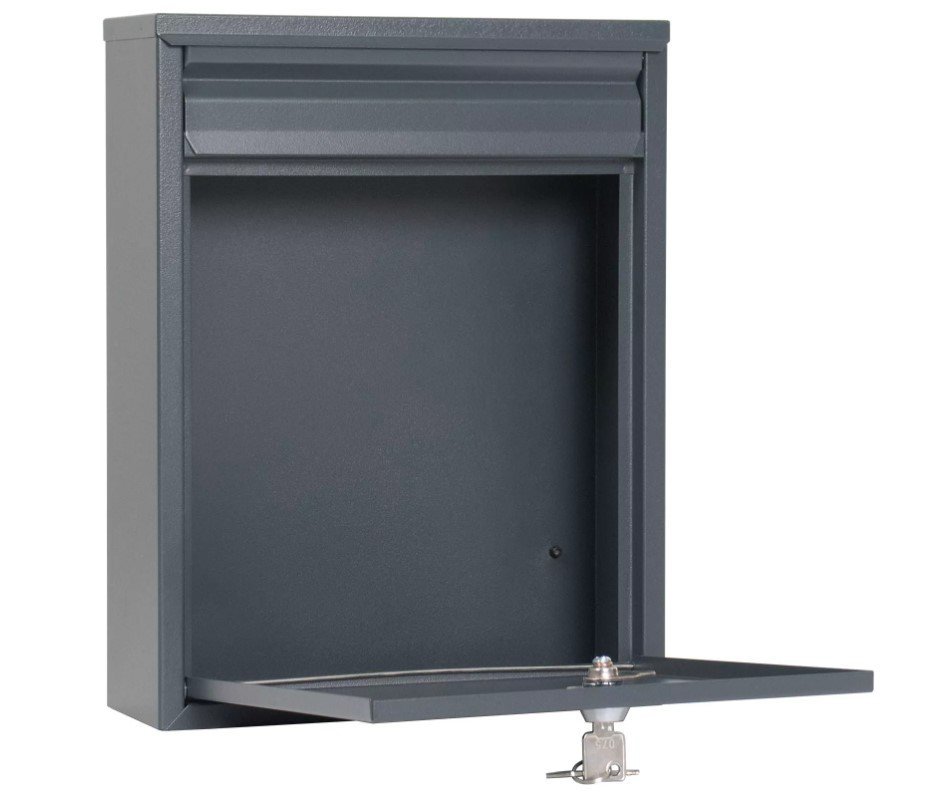 Poštovní schránka, barva antracit, přední i zadní vhoz. Výška 320 x šířka 250 x hloubka 85 mm. Pravoúhlé plochy - schránka je celý popis a parametry