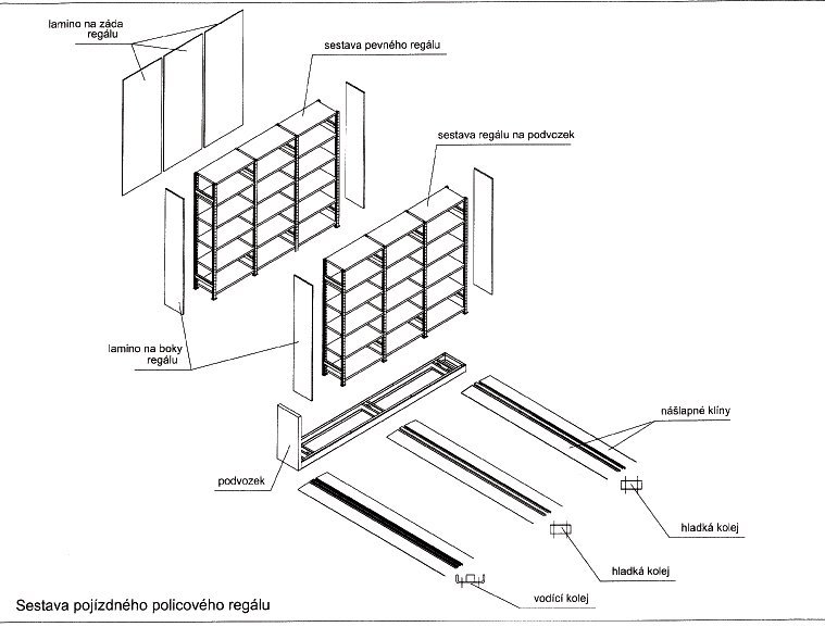 Provedení regálů: lakované stojiny a police - RAL 7035 světle šedá, lakované podvozky a nášlapné klíny - RAL 7016 tmavě šedá, kolejnice - pozink, boční propojení, háčky, výztuhy, spojovací materiál, zavětrovací prvky. Kolejový systém je tvořen kolejnicemi, nášlapnými klíny u krajních kolejnic – 2 ks a dřevotřískovou deskou pokrytou linem mezi kolejnicemi. Tato sestava dále zahrnuje 1 - 6 ks podvozků (řady) dle výběru, na každém 5 regálů o šířce 5 x 830 mm, na výšku mají regály 2 160 mm (vč. podvozku a kolejí), na tuto výšku je počítáno 5 polic ukládacích a jedna krycí ( takže 5+1). Hloubka regálů 300 mm. Nosnost police je minimálně 130 kg. U těchto výrobků doprava i s hodnotou nákupu nad 3.000,- Kč bez DPH hrazena dle místa dodání. Osobní odběr v Chrudimi.