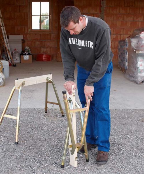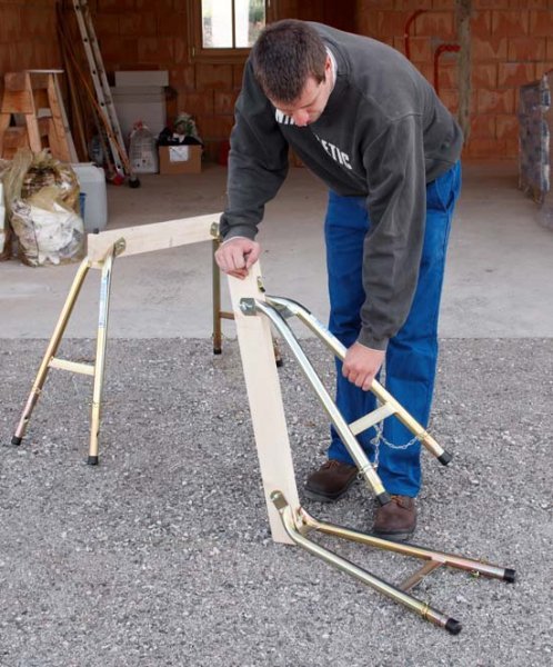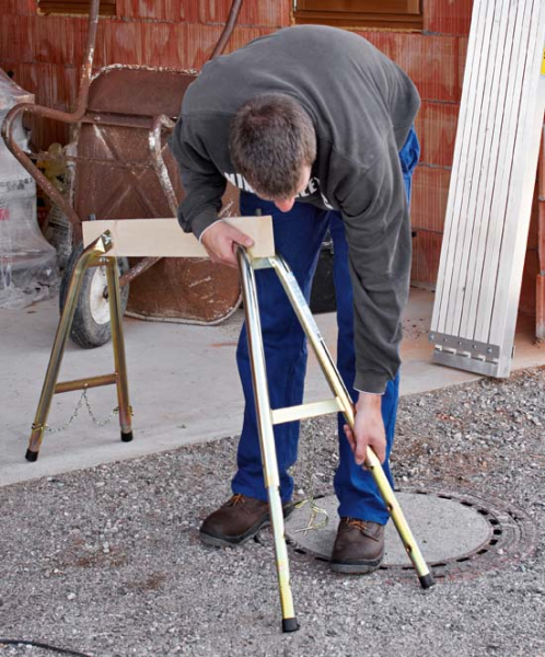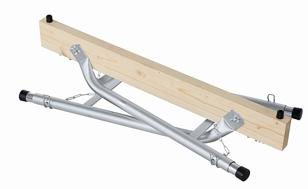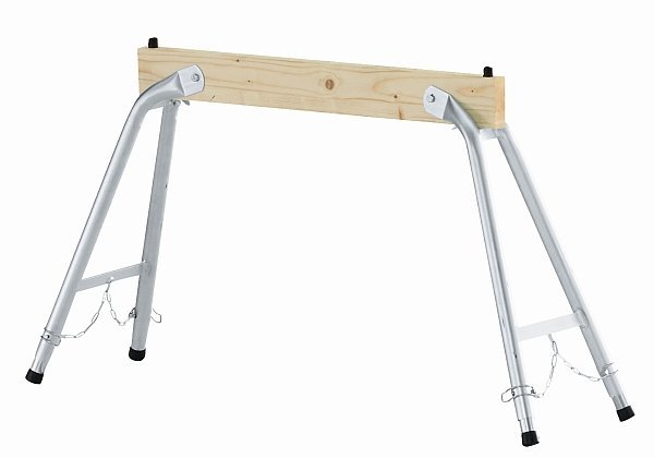 Podstavec tvoří pozinkované ocelové trubky o ø 28 mm. Všechny 4 nohy lze výškově nastavit v rozmezí od 60 do 90 cm. 80 cm dlouhá podkladná plocha s pojistkami proti sklouznutí. Sklopením nohou šetří místo. Protiskluzové patky. Nosnost 150 kg.