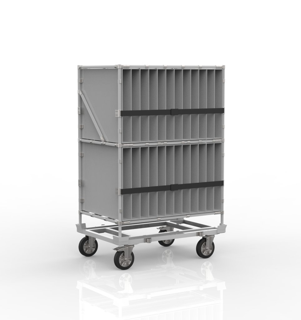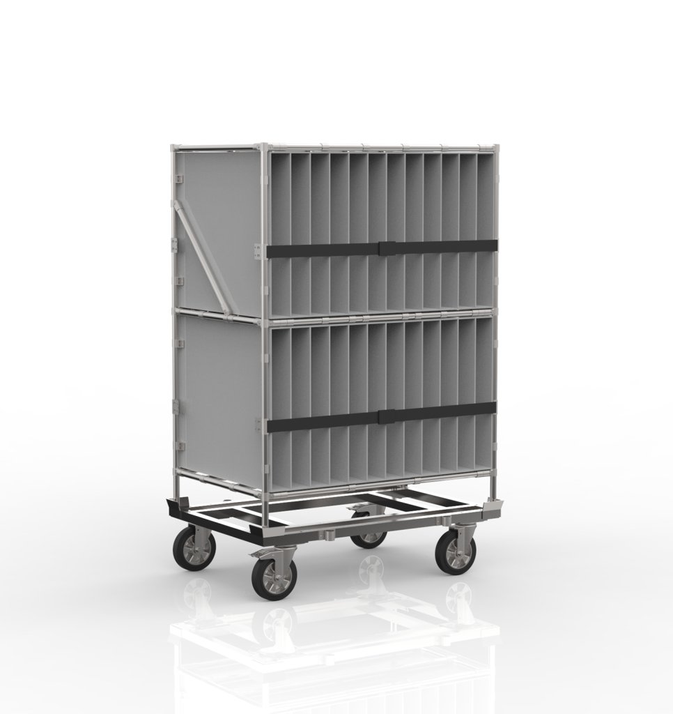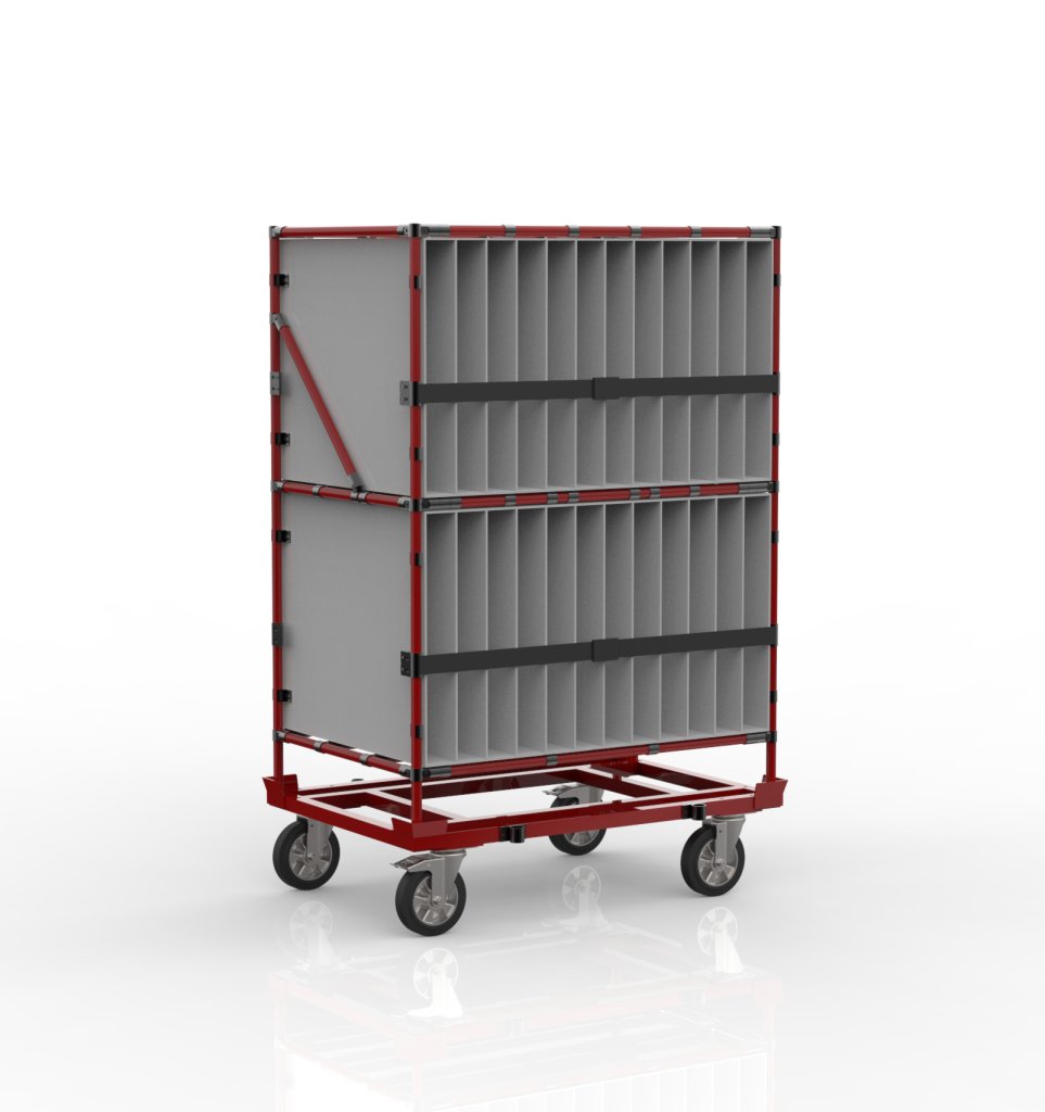 Svařovaný vozík s nástavbou z trubkového systému. Základ vozíku tvoří svařovaný ocelový rám s pozinkovaným povrchem, nástavba je z trubkového stavebnicového systému s laminovanou PP vložkou s vyjímatelným dnem v každé přihrádce, pro bezpečnost uloženého materiálu slouží upínací pásek s oky na každé straně. Součástí jsou dále dvě otočná kolečka s brzdou a dvě otočná kolečka bez brzdy s průměrem 200 mm. Nosnost vozíku 120 kg. Rozměry 1885 x 1203 x 803 mm.