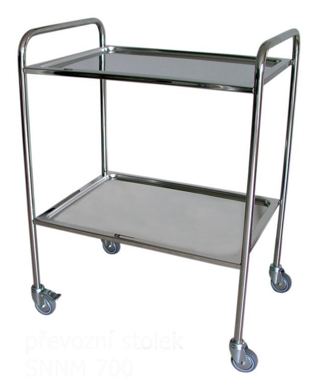 Pojízdný stolek je vyroben z nerezových profilů a v horní části je opatřen dvěma madly. Odkládací plochy tvoří horní lisované a spodní rovné nerezové plato. Stolek je opatřen dvěma brzděnými a dvěma nebrzděnými otočnými kolečky o průměru 75 mm. V případě požadavku je možné stolek vybavit antistatickými kolečky.