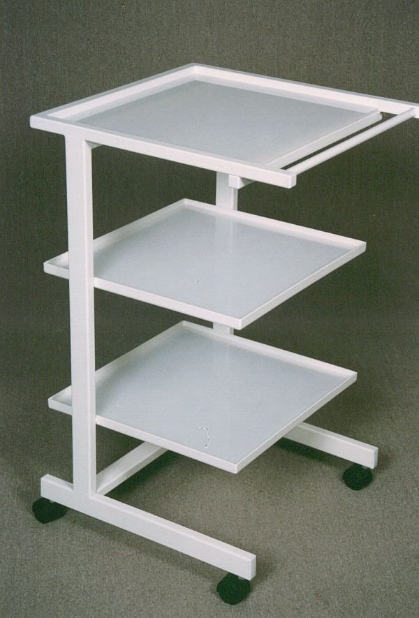 Nástrojový stolek se třemi nerezovými platy, horní plato je lisované se zaoblenými rohy. Výška 800 x šířka 640 x hloubka 480 mm, zatižitelnost nerezového plata až 50 kg. barva konstrukce bílá.