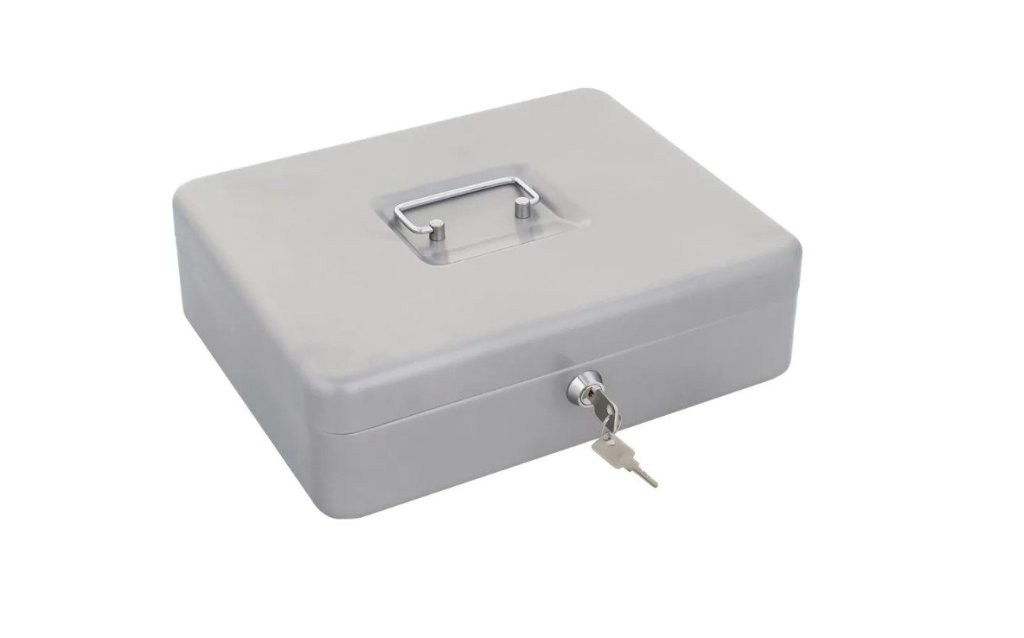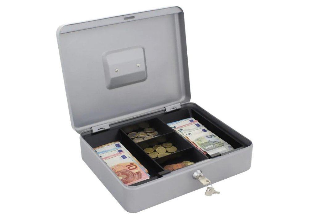 Příruční pokladna s vložkou na mince a bankovky. Uzamykání na klíč.