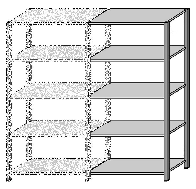 Přístavné regály FIX, provedení v barvě RAL světle šedá, hloubka 400, 500 nebo 600 mm, výška 2000 (5 polic), 2500 (6 polic) a 3000 mm (7 polic), šířka 1000 mm. Nosnost polic 100 nebo 230 kg. Pozor, pouze jedna stojina - slouží k nastavování základních regálů.