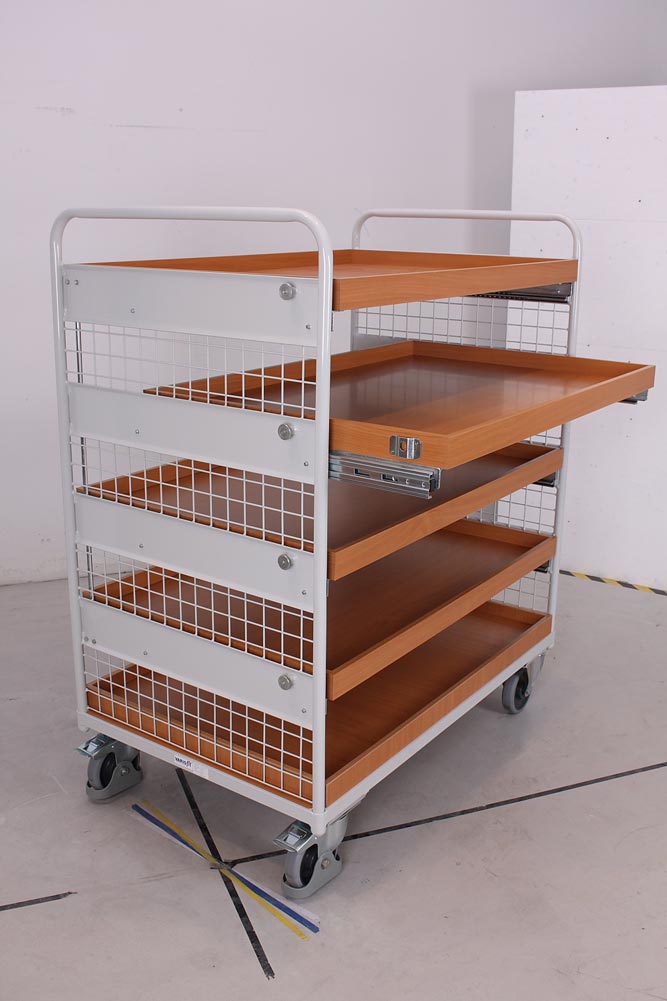 Příkladem je úprava policového vozíku, u něhož byly přidány 80% výsuvy polic s nosností 80 kg a uzamykání výsuvů zásuvek.