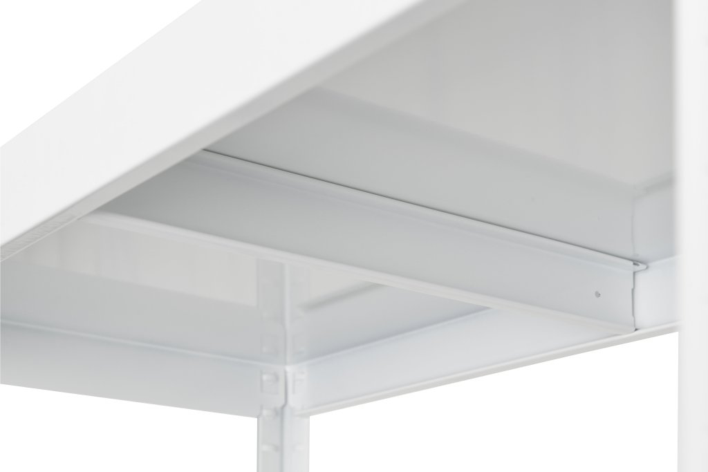 Univerzální regál, bezšroubový montážní systém, nosnost police 130 kg. Výška regálu 1800 x šířka 600 x hloubka 400 mm, 5x police. Provedení bílá barva.