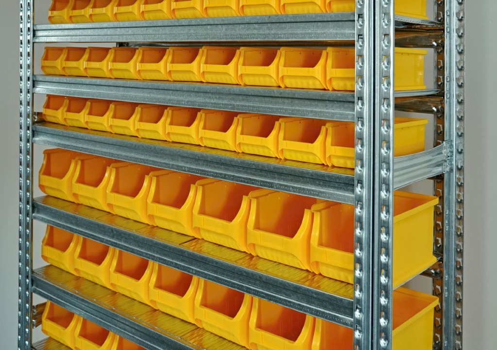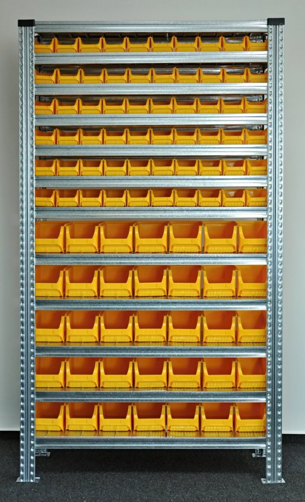 Bezšroubový kovový regál s plastovými boxy. 12x police, nosnost 125 kg, nosnost sloupce 1100 kg. Rozměry regálu v. 1972 x š. 1124 x h. 330 mm. Obsahuje 60x plastový box 456232 a 35x plastový box 456208. Záruka 2 roky.