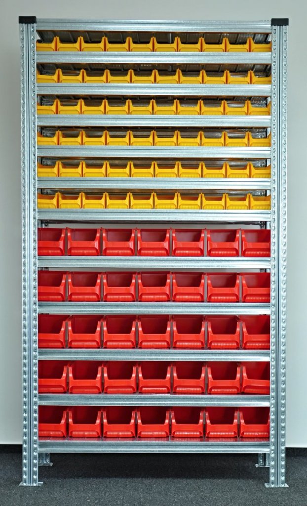 Bezšroubový kovový regál s plastovými boxy. 12x police, nosnost 125 kg, nosnost sloupce 1100 kg. Rozměry regálu v. 1972 x š. 1124 x h. 330 mm. Obsahuje 60x plastový box 456232 a 35x plastový box 456209. Záruka 2 roky.