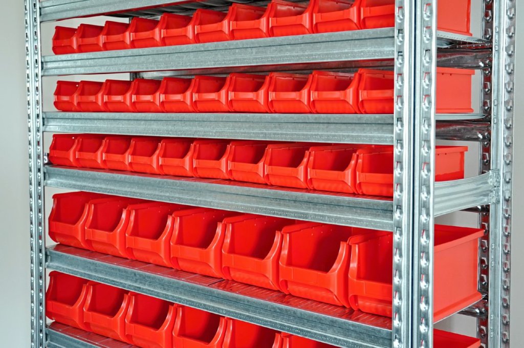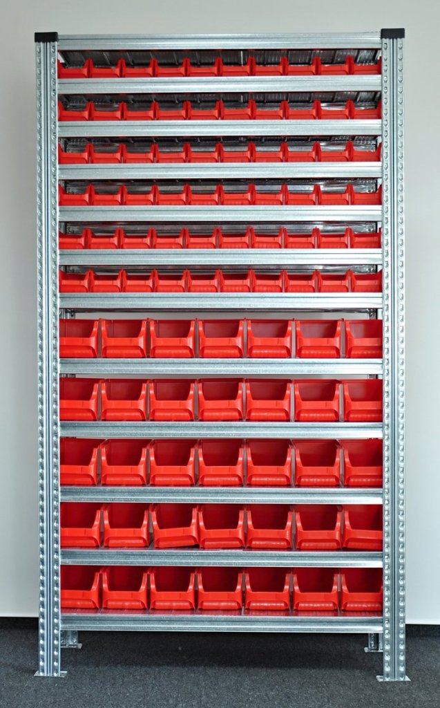 Bezšroubový kovový regál s plastovými boxy. 12x police, nosnost 125 kg, nosnost sloupce 1100 kg. Rozměry regálu v. 1972 x š. 1124 x h. 330 mm. Obsahuje 60x plastový box 456232 a 35x plastový box 456210. Záruka 2 roky.