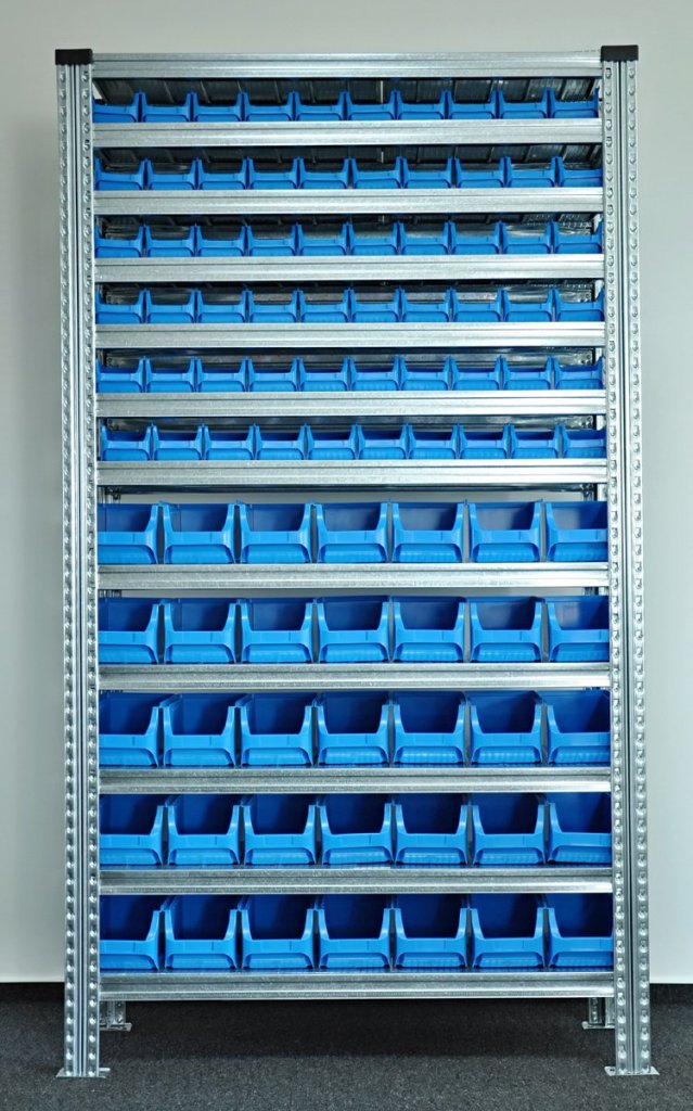 Bezšroubový kovový regál s plastovými boxy. 12x police, nosnost 125 kg, nosnost sloupce 1100 kg. Rozměry regálu v. 1972 x š. 1124 x h. 330 mm. Obsahuje 60x plastový box 456230 a 35x plastový box 456208. Záruka 2 roky.