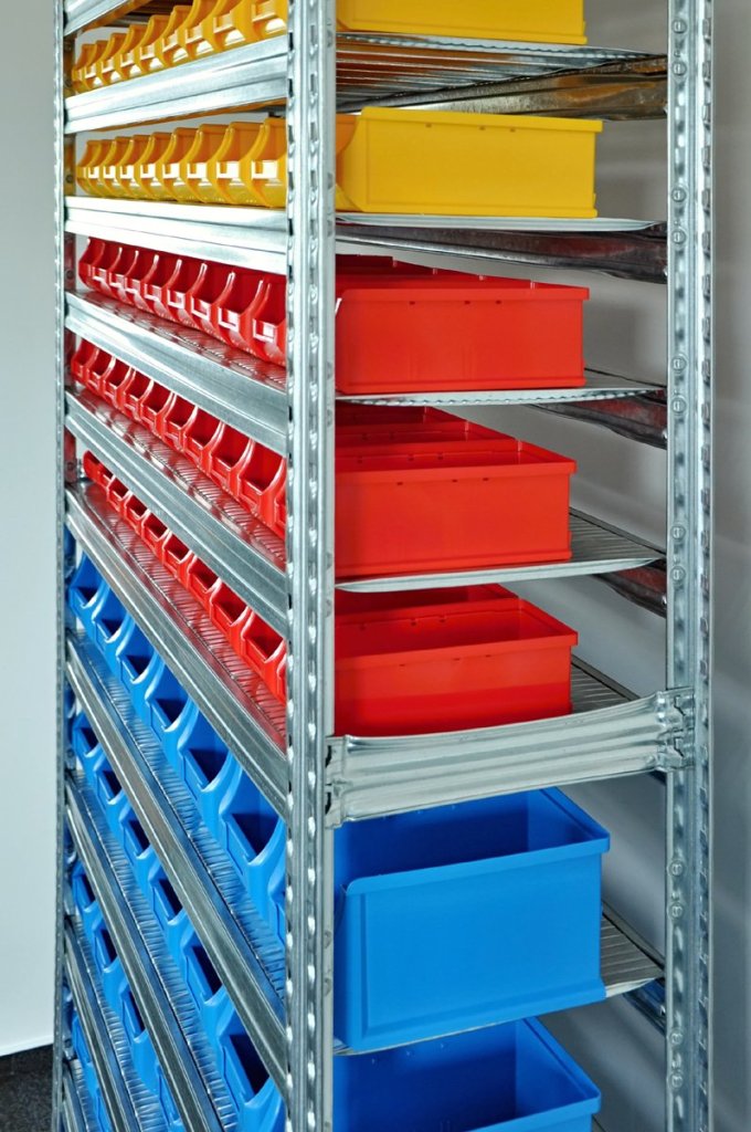 Bezšroubový kovový regál s plastovými boxy. 12x police, nosnost 125 kg, nosnost sloupce 1100 kg. Rozměry regálu v. 1972 x š. 1124 x h. 330 mm. Obsahuje 30x plastový box 456232, 30x plastový box 456231 a 35x plastový box 456208. Záruka 2 roky.