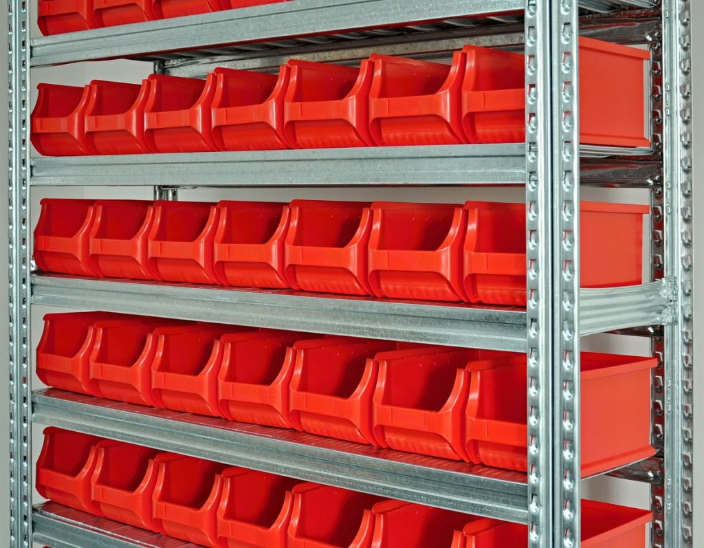 • bezšroubový kovový regál s plastovými boxy