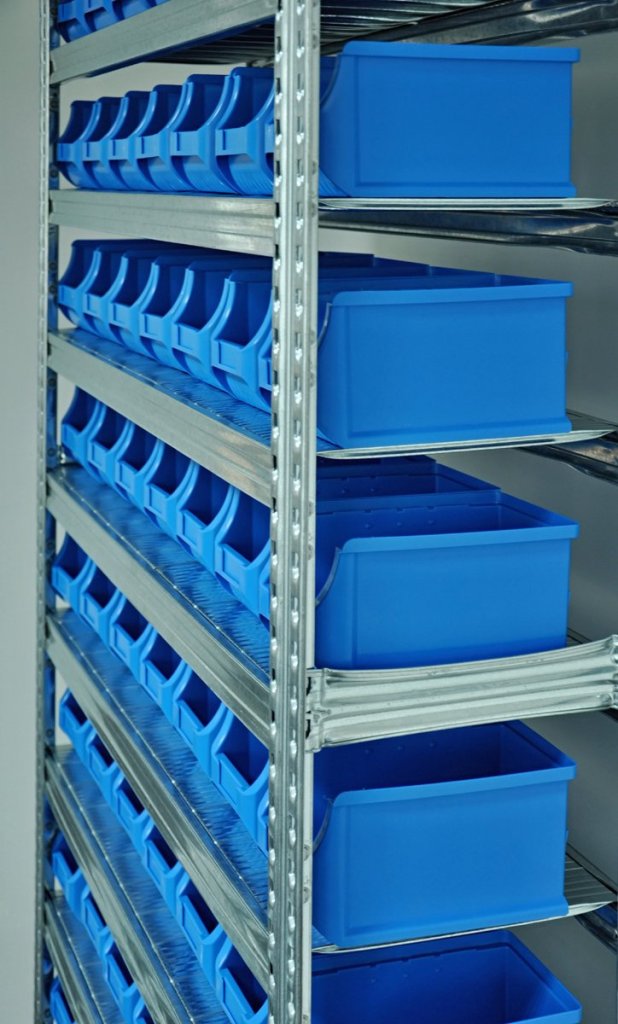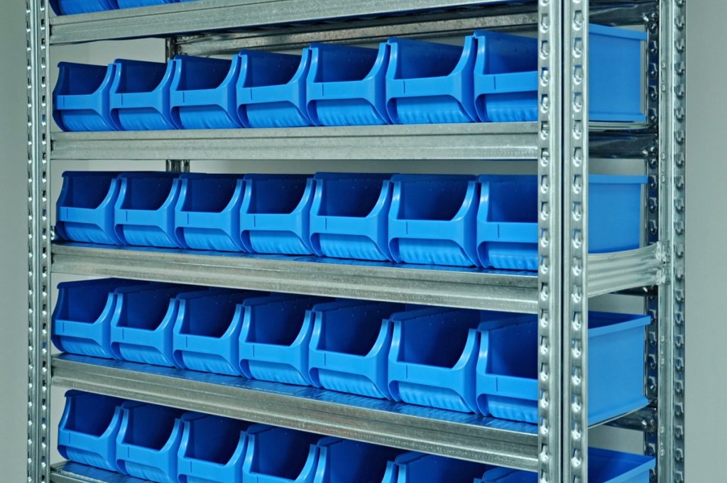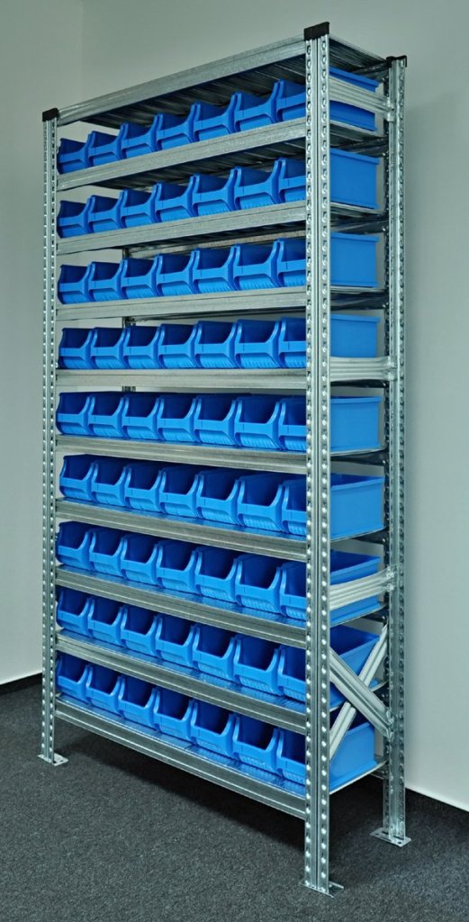 Bezšroubový kovový regál s plastovými boxy. 10x police, nosnost 125 kg, nosnost sloupce 1100 kg. Rozměry regálu v. 1972 x š. 1124 x h. 330 mm. Obsahuje 63x plastový box 456210. Záruka 2 roky.