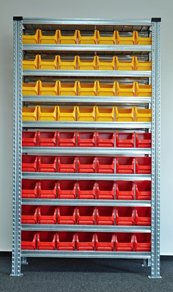 Bezšroubový kovový regál s plastovými boxy. 10x police, nosnost 125 kg, nosnost sloupce 1100 kg. Rozměry regálu v. 1972 x š. 1124 x h. 330 mm. Obsahuje 28x plastový box 456210 a 35x plastový box 456209. Záruka 2 roky.