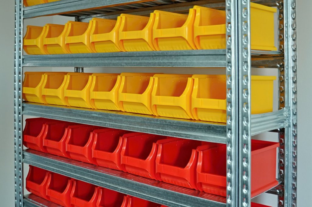 • bezšroubový kovový regál s plastovými boxy