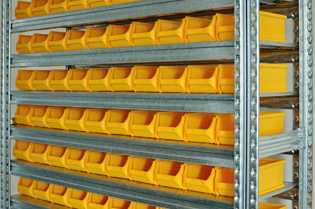 Bezšroubový kovový regál s plastovými boxy. 15x police, nosnost 125 kg, nosnost sloupce 1100 kg. Rozměry regálu v. 1972 x š. 1124 x h. 330 mm. Obsahuje 140x plastový box 456230. Záruka 2 roky.