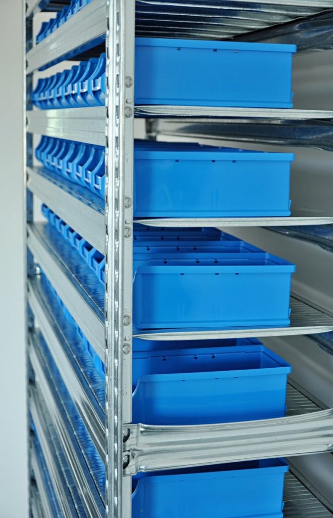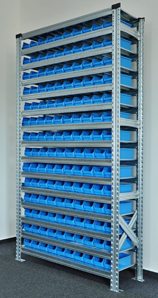 Bezšroubový kovový regál s plastovými boxy. 15x police, nosnost 125 kg, nosnost sloupce 1100 kg. Rozměry regálu v. 1972 x š. 1124 x h. 330 mm. Obsahuje 140x plastový box 456230. Záruka 2 roky.