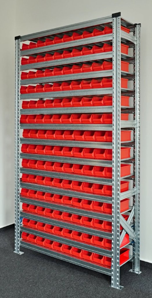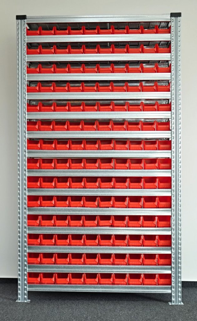 Bezšroubový kovový regál s plastovými boxy. 15x police, nosnost 125 kg, nosnost sloupce 1100 kg. Rozměry regálu v. 1972 x š. 1124 x h. 330 mm. Obsahuje 140x plastový box 456231. Záruka 2 roky.