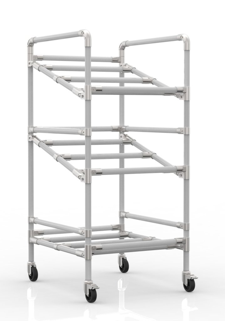 Regálový vozík na přepravky s jednou rovnou a dvěma šikmými policemi je praktickým pomocníkem pro manipulaci ve výrobních firmách a logistických centrech, zejména v oblasti e-commerce. Součástí vozíku jsou dvě otočná kolečka s brzdou o průměru 75 mm a dvě otočná kolečka bez brzdy. Předností těchto koleček je nízký valivý odpor, a díky tomu komfortní manipulace. Konfiguraci koleček je možné změnit dle požadavků zákazníka. Celková nosnost je 180 kg, nosnost na polici 60 kg. Rozměry jsou 1250 x 572 x 670 mm.