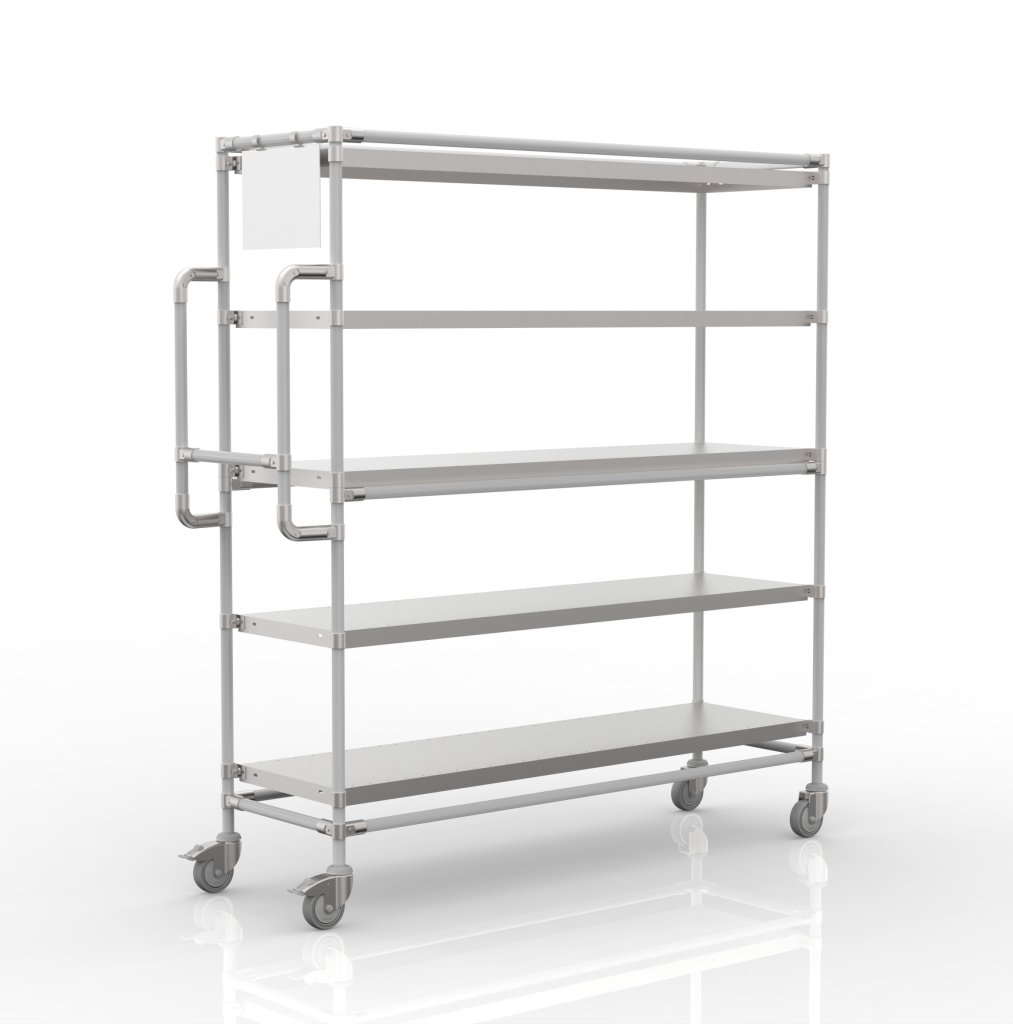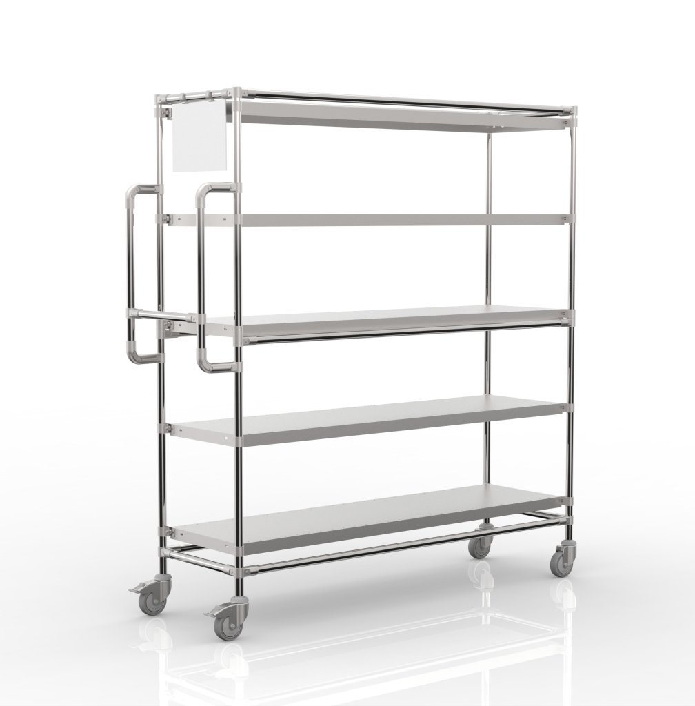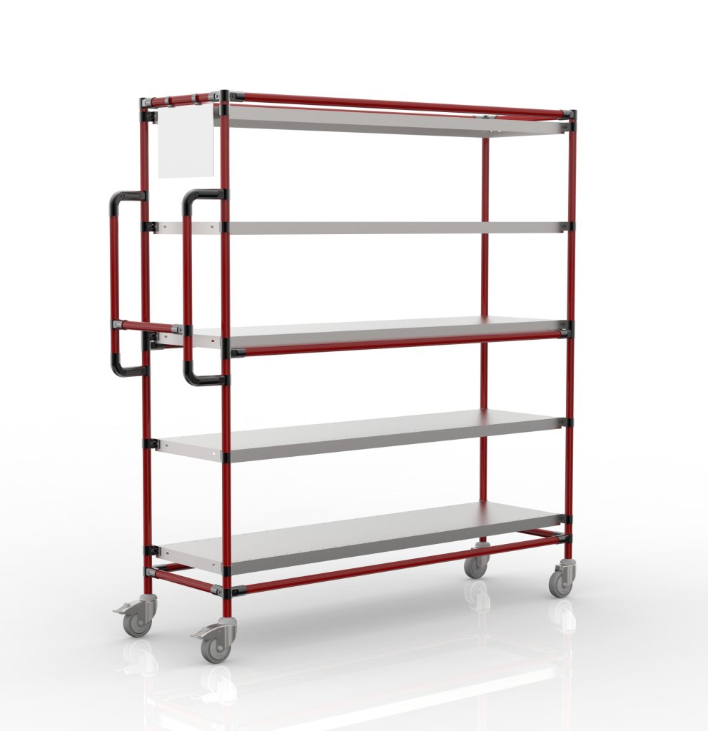 Součástí vozíku jsou dvě otočná kolečka s brzdou a dvě otočná kolečka bez brzdy o průměru 100 mm. Předností těchto koleček je nízký valivý odpor a díku tomu komfortní manipulace. Konfiguraci koleček je možné změnit dle požadavků zákazníka. Vozík je také vybaven ergonomickou rukojetí pro snadnější a komfortnější manipulaci. Celková nosnost 300 kg, nosnost na polici 60 kg. Rozměry 1765 x 1566 x 482 mm.