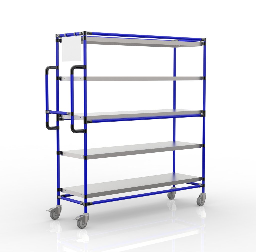 Regálový vozík na přepravky s pěti rovnými policemi je praktickým pomocníkem pro manipulaci ve výrobních firmách a logistických centrech, zejména v oblasti e-commerce.
