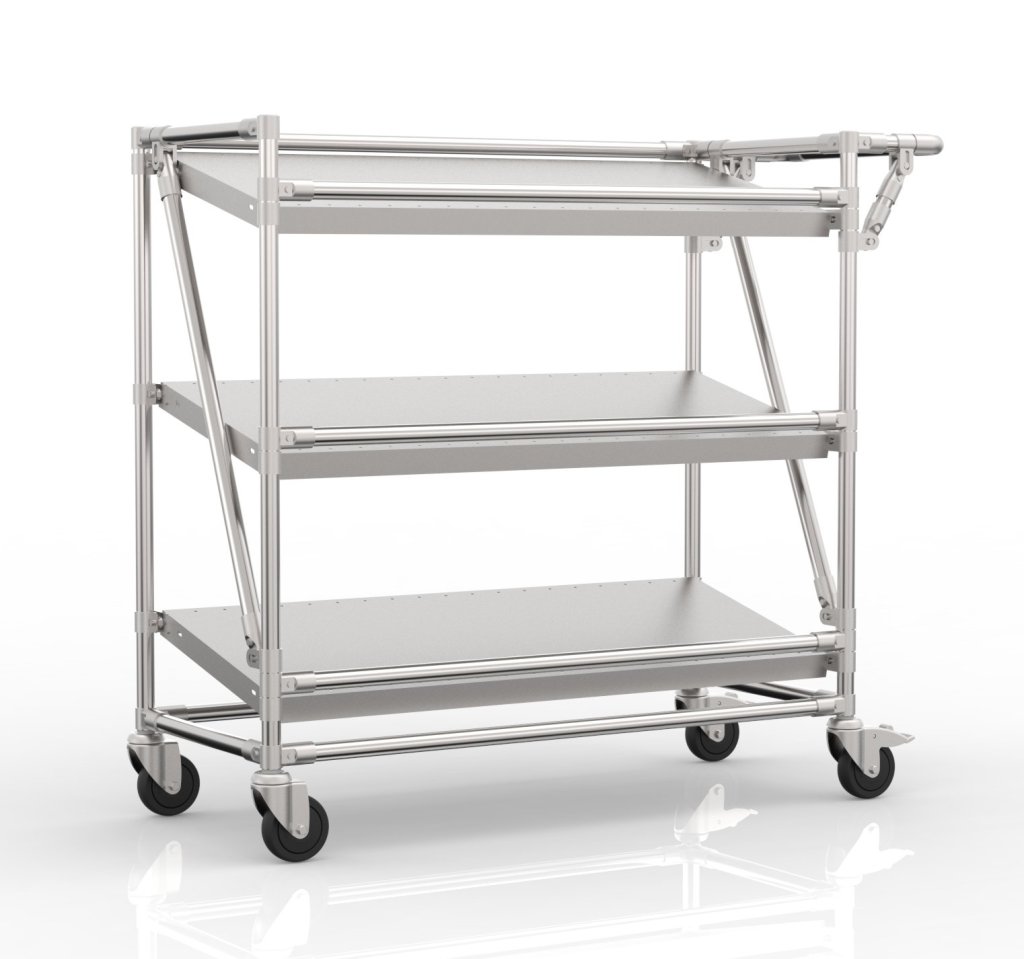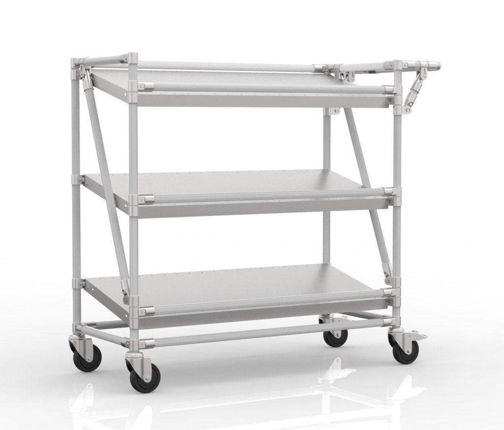 Regálový vozík na přepravky se třemi šikmými policemi je praktickým pomocníkem pro maipulaci ve výrobních firmách a logistických centrech, zejména v oblasti e-commerce. Součástí vozíku jsou dvě otočná kolečka s brzdou a dvě otočná kolečka bez brzdy o průměru 100 mm. Předností těchto koleček je nízký valivý odpor a díku tomu komfortní manipulace. Konfiguraci koleček je možné změnit dle požadavků zákazníka. Vozík je také vybaven ergonomickou rukojetí pro snadnější a komfortnější manipulaci. Celková nosnost 180 kg, nosnost na polici 60 kg. Rozměry 1078 x 1066 x 465 mm.