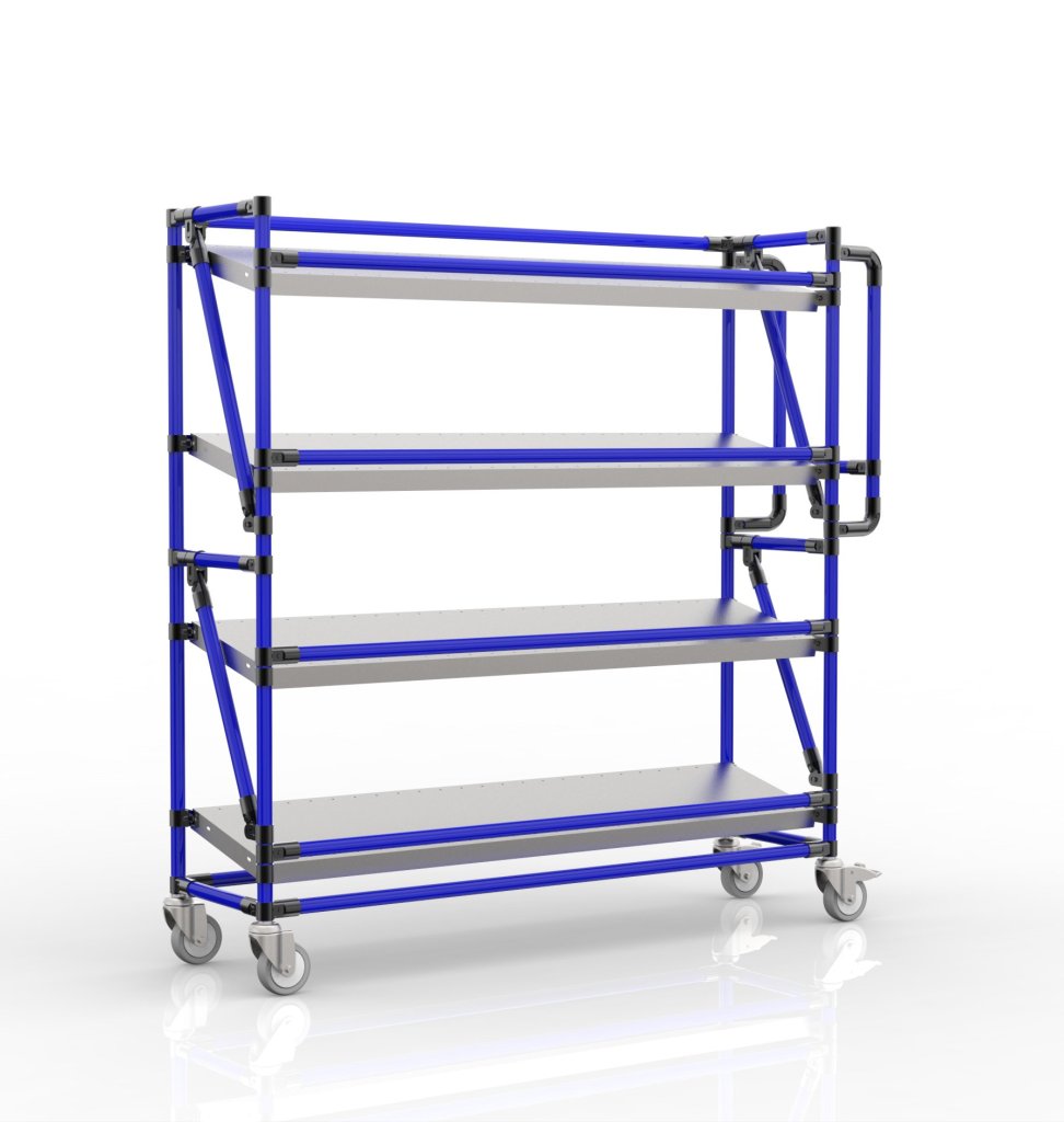 Regálový vozík na přepravky se čtyřmi šikmými policemi je praktickým pomocníkem pro manipulaci ve výrobních firmách a logistických centrech, zejména v oblasti e-commerce.