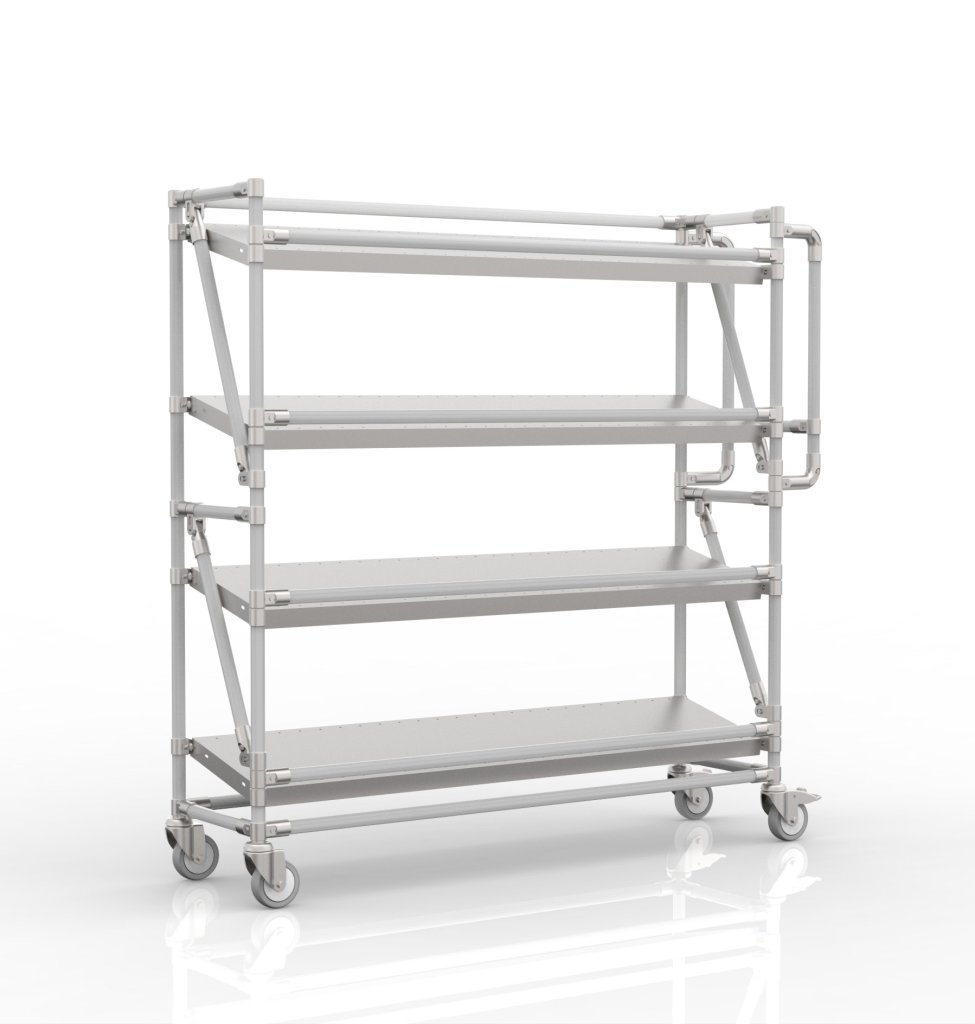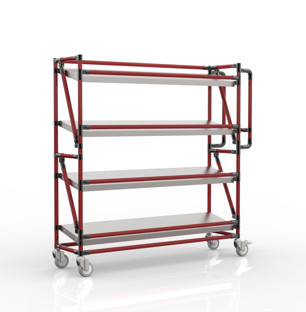 Součástí vozíku jsou dvě otočná kolečka s brzdou a dvě otočná kolečka bez brzdy o průměru 100 mm. Předností těchto koleček je nízký valivý odpor a díku tomu komfortní manipulace. Konfiguraci koleček je možné změnit dle požadavků zákazníka. Vozík je také vybaven ergonomickou rukojetí pro snadnější a komfortnější manipulaci. Celková nosnost 300 kg, nosnost na polici 60 kg. Rozměry 1438 x 1361 x 374 mm.