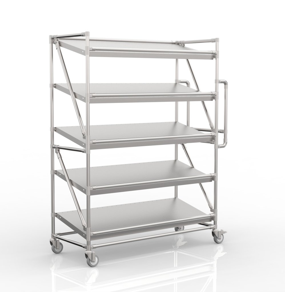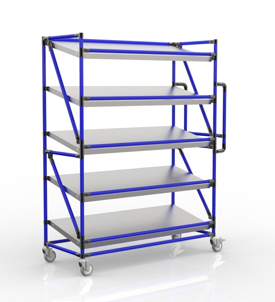 Regálový vozík na přepravky s pěti šikmými policemi je praktickým pomocníkem pro manipulaci ve výrobních firmách a logistických centrech.
