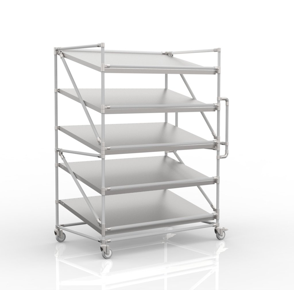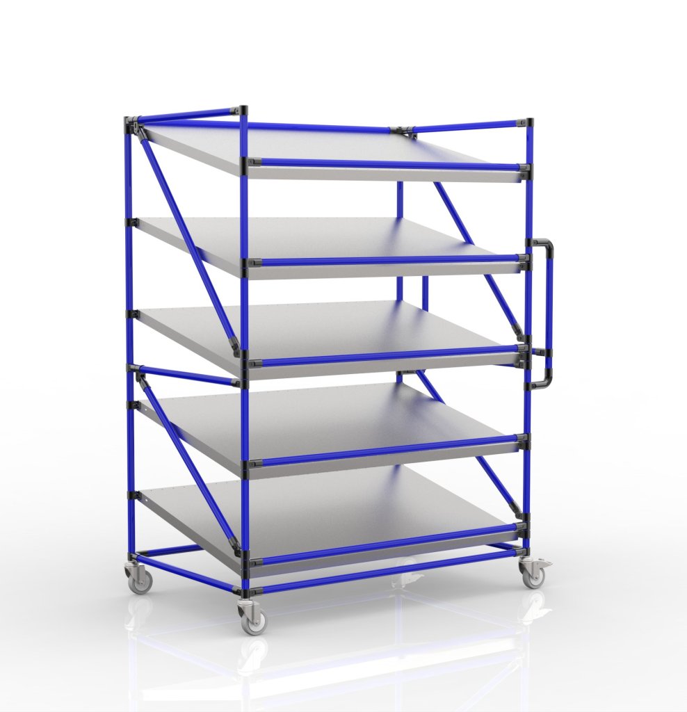 Regálový vozík na přepravky s pěti šikmými policemi je praktickým pomocníkem pro manipulaci ve výrobních firmách a logistických centrech, zejména v oblasti e-commerce.
