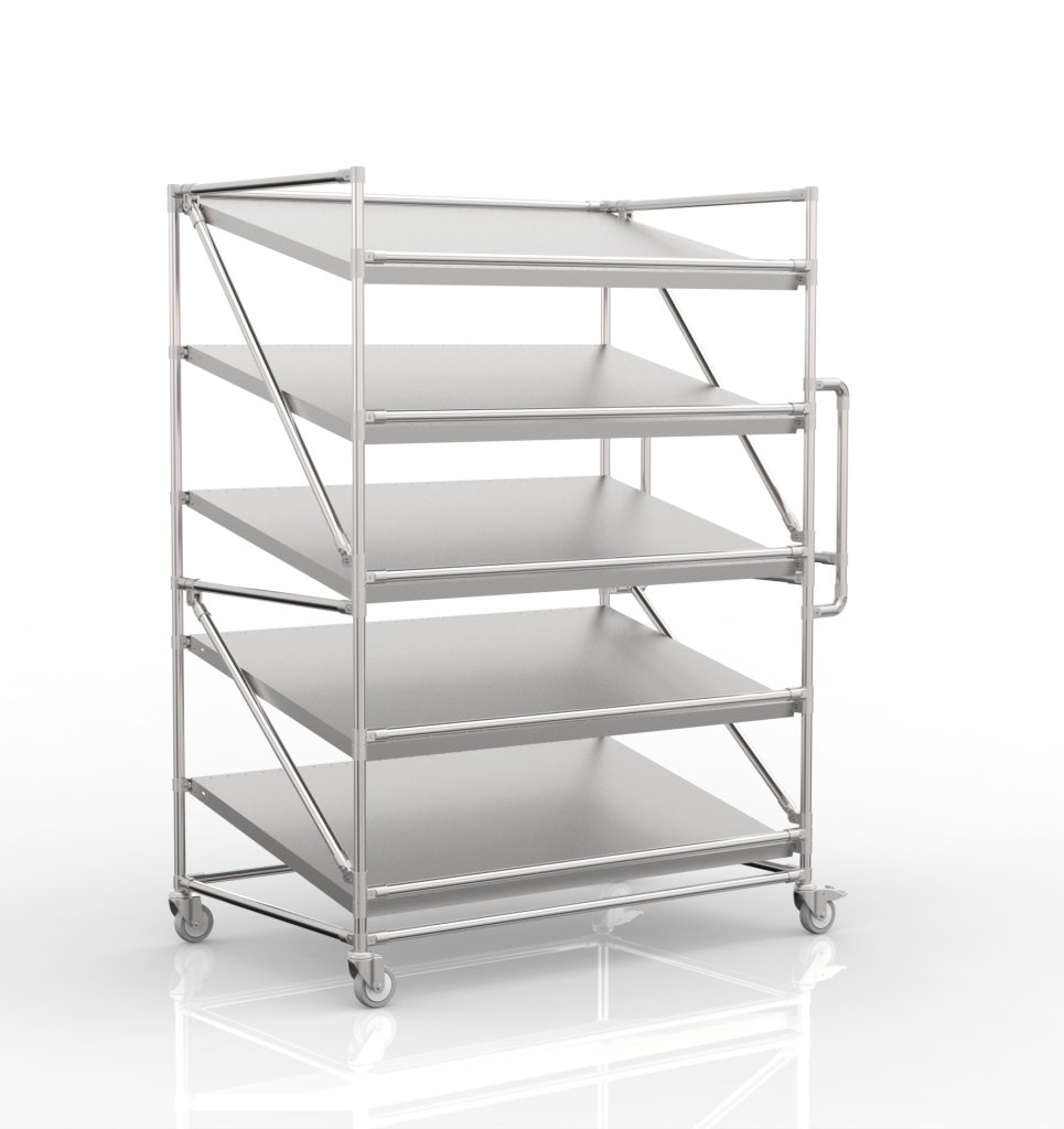 Regálový vozík na přepravky s pěti šikmými policemi je praktickým pomocníkem pro manipulaci ve výrobních firmách a logistických celý popis a parametry