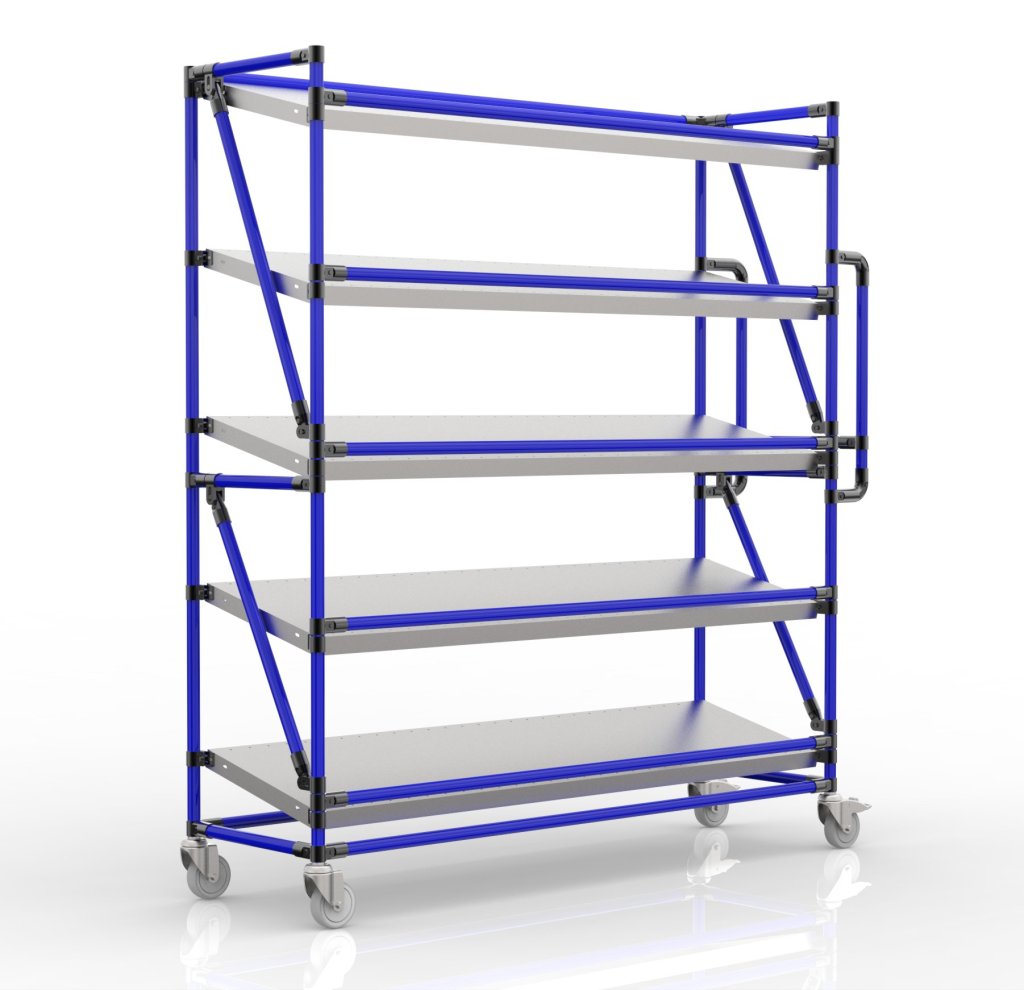Regálový vozík na přepravky s pěti šikmými policemi je praktickým pomocníkem pro manipulaci ve výrobních firmách a logistických centrech, zejména v oblasti e-commerce.