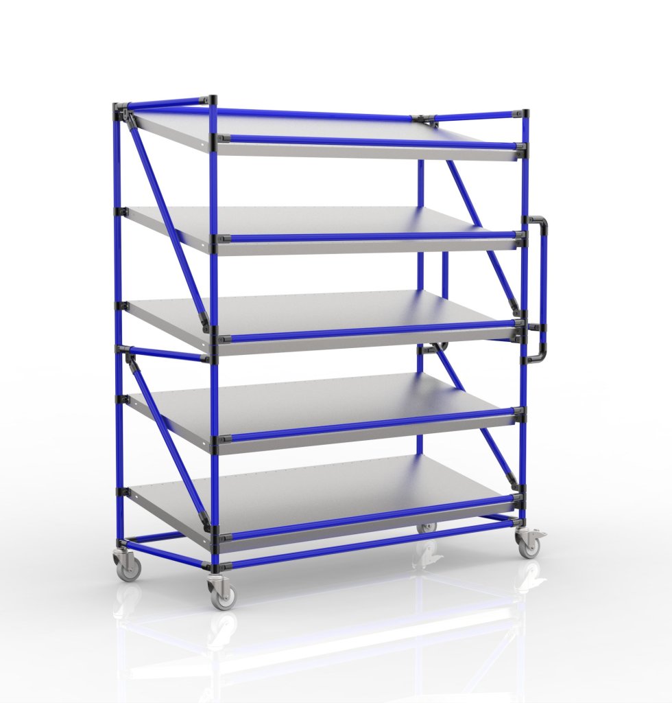 Regálový vozík na přepravky s pěti šikmými policemi je praktickým pomocníkem pro manipulaci ve výrobních firmách a logistických centrech, zejména v oblasti e-commerce.