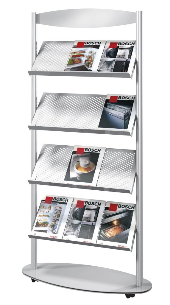 Kovový mobilní stojan na prospekty a propagační materiály. Stabilní konstrukce, 4x police z kvalitní děrované oceli. Úložná kapacita 12x DIN A4. Výška 1630 mm x šířka 780 mm x hloubka 340 mm.