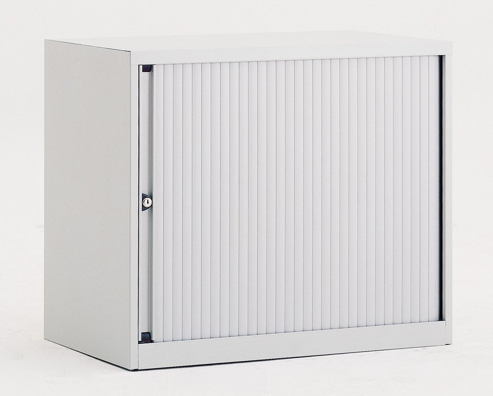 Kovové skříně s horizontální roletou s jednou policí, šířka 800, výška 695, hloubka 430 mm, různé barvy.