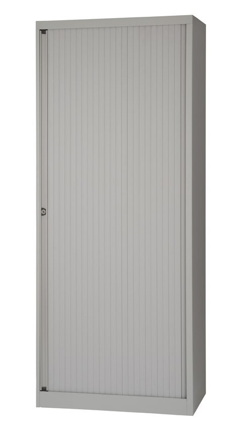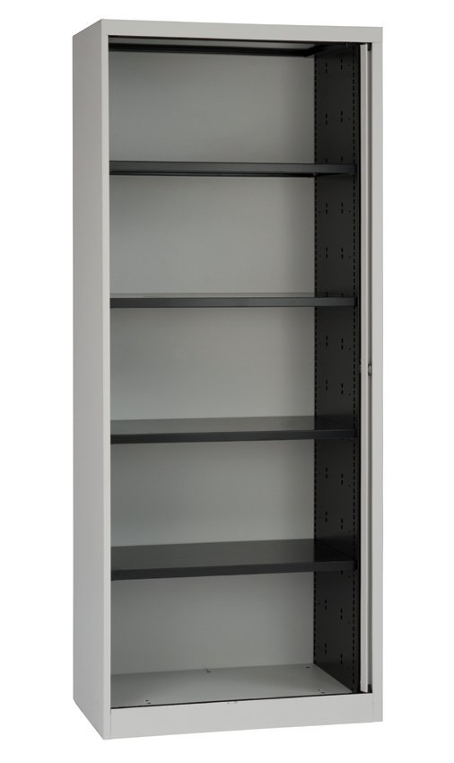 Kovové skříně s horizontální roletou se čtyřmi policemi, šířka 800, výška 1980, hloubka 430 mm, různé barvy.
