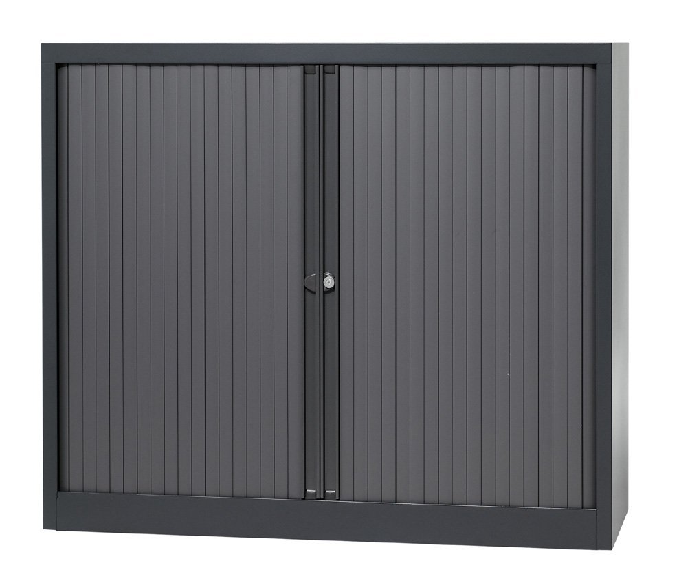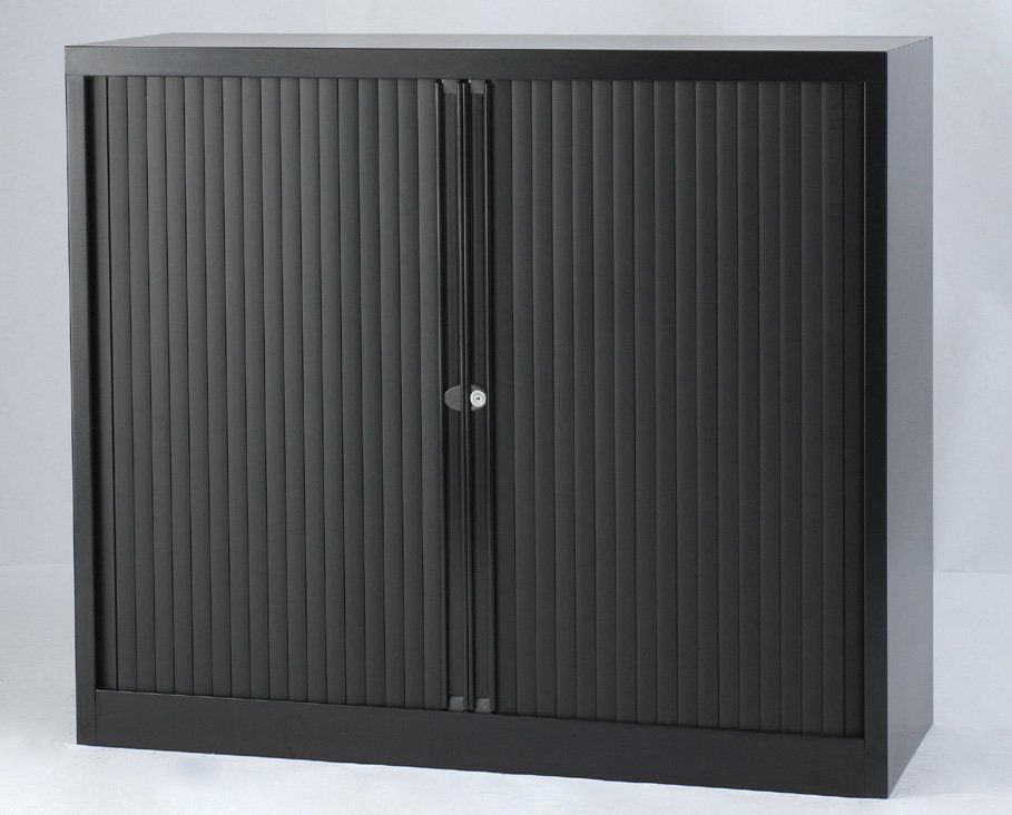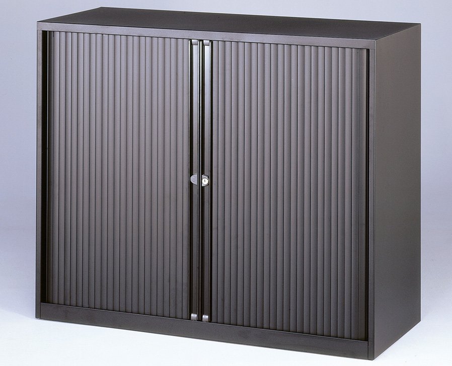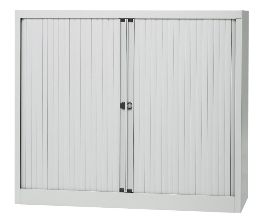 Kovové skříně s horizontální roletou se dvěmi policemi šířka 1200, výška 1030, hloubka 430 mm, různé barvy.