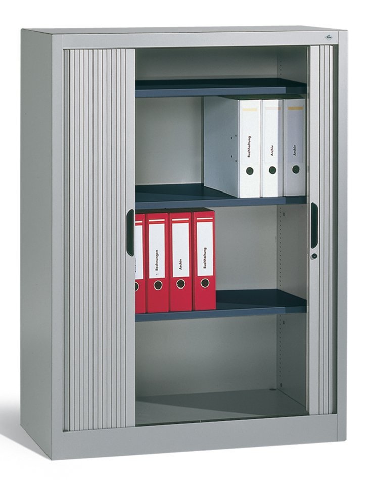 Roletová kovová skříň dvoudveřová. Výška 1345, šířka 1000, hloubka 420 mm. 3 police. Barva korpusu a rolety světle šedá RAL 7035/antracit RAL 7021.